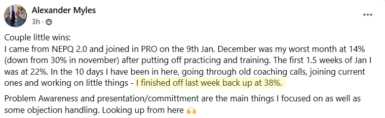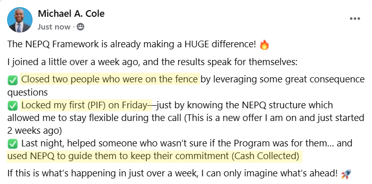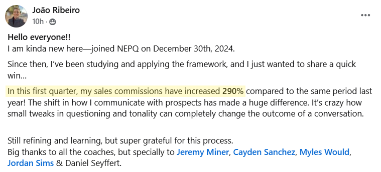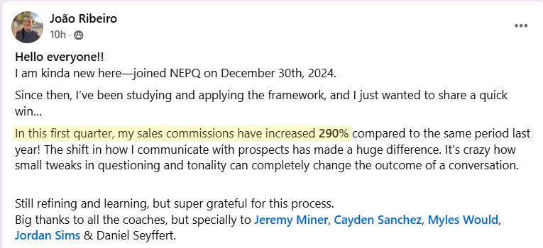 Get real-time feedback from NEPQ-certified coaches and community members who are actively closing deals.